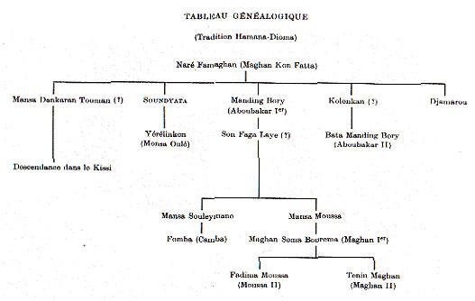 Ainsi donc le fameux Kankou Moussa est bien le petit neveu de Soundjata mais par la branche masculine 10. Voici donc corrigé grâce aux traditions, l'arbre généalogique de Mali aux XIIIe et XIVe siècles (voir tableau)